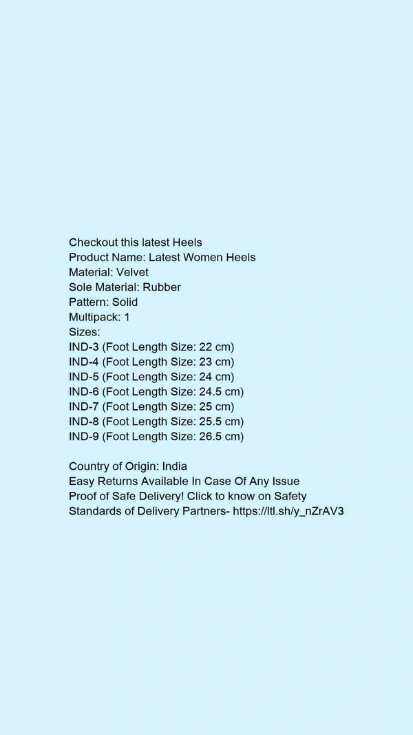 Product Name: *Latest Women Heels*Material: VelvetSole Material: RubberPattern: SolidMultipack: 1