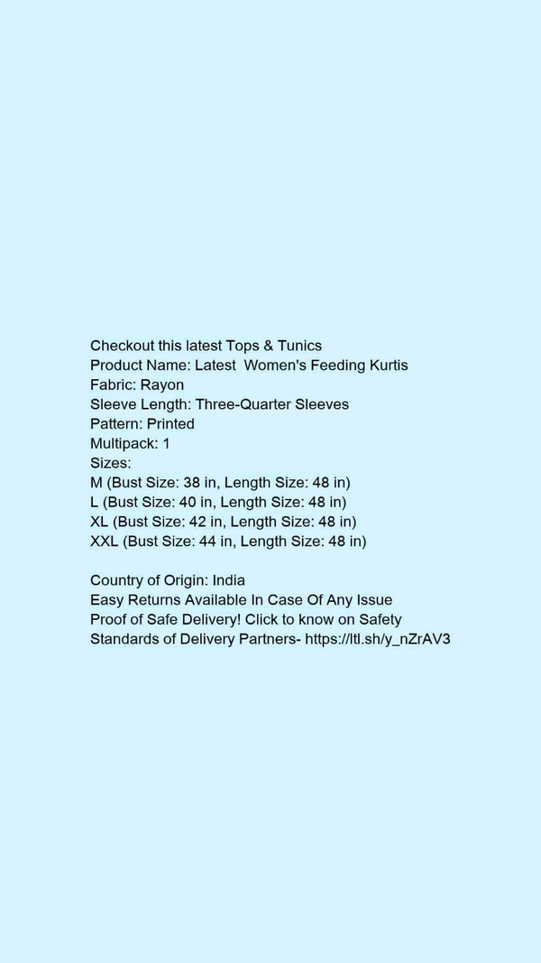 Product Name: *Latest Women's Feeding Kurtis*Fabric: RayonSleeve Length: Three-Quarter SleevesPattern: PrintedMultipack: 1