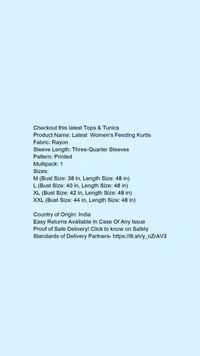 Product Name: *Latest Women's Feeding Kurtis*Fabric: RayonSleeve Length: Three-Quarter SleevesPattern: PrintedMultipack: 1