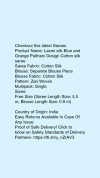Product Name: *Laxmi silk Blue and Orange Paithani Design Cotton silk saree*Saree Fabric: Cotton SilkBlouse: Separate Blouse PieceBlouse Fabric: Cotton SilkPattern: Zari WovenMultipack: SingleSizes: Free Size (Saree Length Size: 5.5 m, Blouse Length Size: 0.8 m)