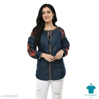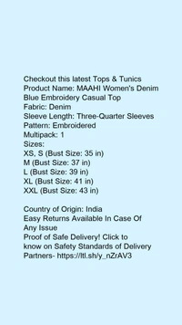 Product Name: *MAAHI Women's Denim Blue Embroidery Casual Top*Fabric: DenimSleeve Length: Three-Quarter SleevesPattern: EmbroideredMultipack: 1