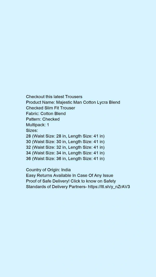 Product Name: *Majestic Man Cotton Lycra Blend Checked Slim Fit Trouser*Fabric: Cotton BlendPattern: CheckedMultipack: 1