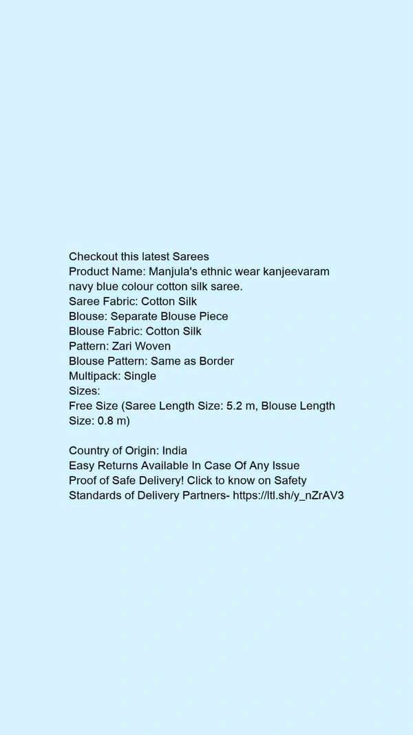 Product Name: *Manjula's ethnic wear kanjeevaram maroon colour cotton silk saree.*Saree Fabric: Cotton SilkBlouse: Separate Blouse PieceBlouse Fabric: Cotton SilkPattern: Zari WovenBlouse Pattern: Same as BorderMultipack: Single