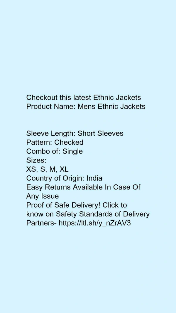 Product Name: *Mens Ethnic Jackets *Sleeve Length: Short SleevesPattern: CheckedCombo of: Single