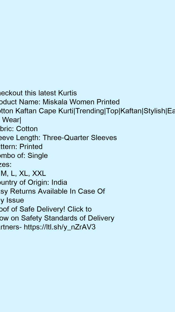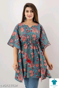 Product Name: *Miskala Women Printed Cotton Kaftan Cape Kurti|Trending|Top|Kaftan|Stylish|Easy To Wear|*Fabric: CottonSleeve Length: Three-Quarter SleevesPattern: PrintedCombo of: Single