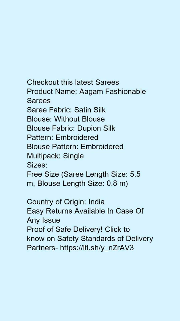 Product Name: *Myra Alluring Sarees*Saree Fabric: Satin SilkBlouse: Without BlouseBlouse Fabric: Dupion SilkPattern: EmbroideredBlouse Pattern: EmbroideredMultipack: Single