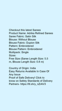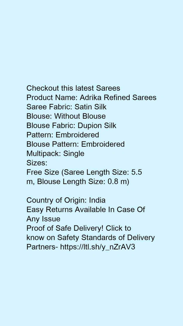 Product Name: *Myra Alluring Sarees*Saree Fabric: Satin SilkBlouse: Without BlouseBlouse Fabric: Dupion SilkPattern: EmbroideredBlouse Pattern: EmbroideredMultipack: Single