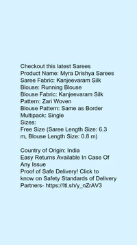 Product Name: *Myra Drishya Sarees*Saree Fabric: Kanjeevaram SilkBlouse: Running BlouseBlouse Fabric: Kanjeevaram SilkPattern: Zari WovenBlouse Pattern: Same as BorderMultipack: Single