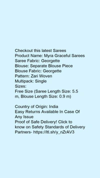 Product Name: *Myra Graceful Sarees*Saree Fabric: GeorgetteBlouse: Separate Blouse PieceBlouse Fabric: GeorgettePattern: Zari WovenMultipack: Single