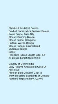 Product Name: *Myra Superior Sarees*Saree Fabric: Satin SilkBlouse: Running BlouseBlouse Fabric: GeorgettePattern: Woven DesignBlouse Pattern: EmbroideredMultipack: Single