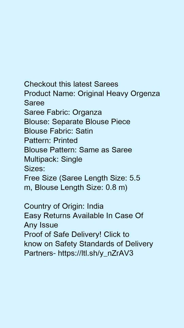 Product Name: *Original Heavy Orgenza Saree*Saree Fabric: OrganzaBlouse: Separate Blouse PieceBlouse Fabric: SatinPattern: PrintedBlouse Pattern: Same as SareeMultipack: Single