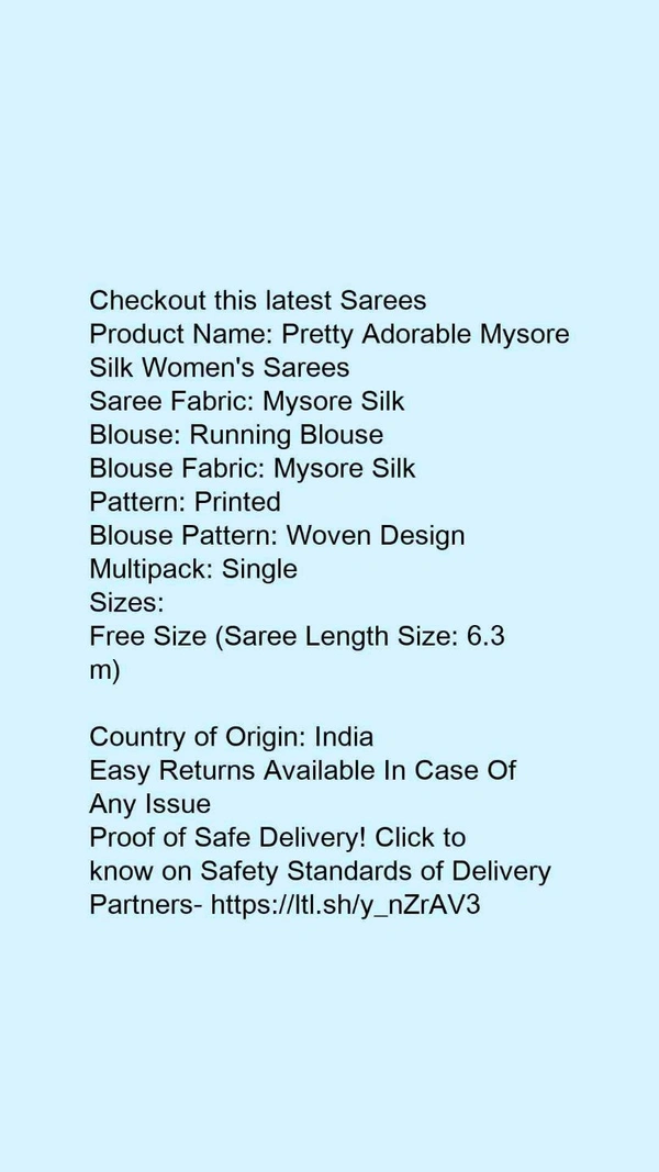 Product Name: *Pretty Adorable Mysore Silk Women's Sarees*Saree Fabric: Mysore SilkBlouse: Running BlouseBlouse Fabric: Mysore SilkPattern: Printed