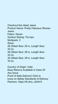 Product Name: *Pretty Fabulous Women Jeans*Fabric: DenimSurface Styling: Tie-UpsMultipack: 2