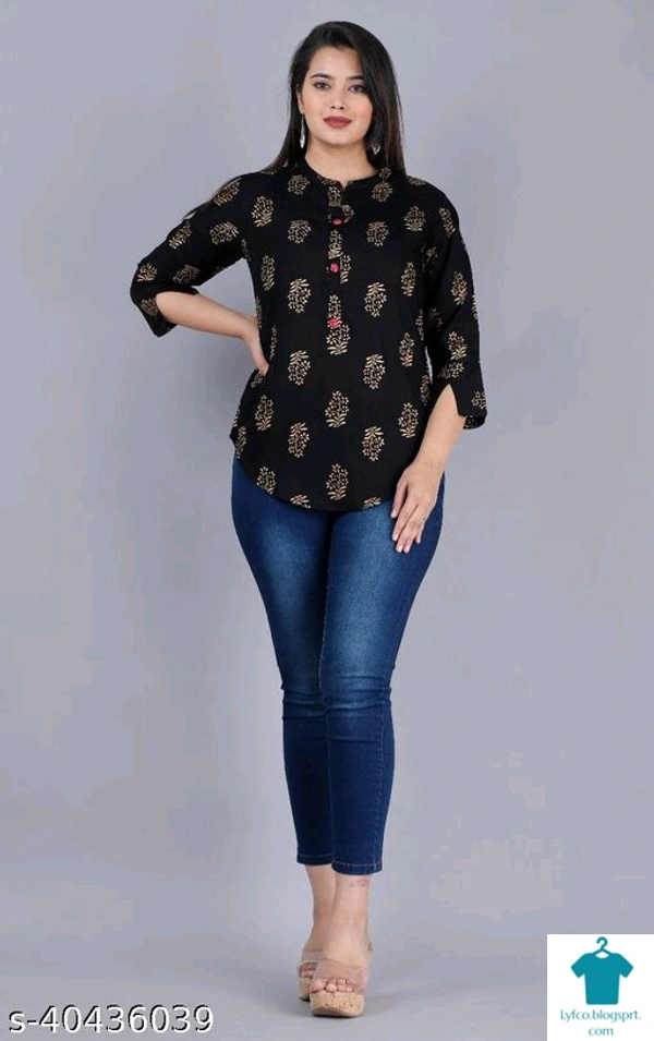 Product Name: *Pretty Partywear Women Tops & Tunics*Fabric: RayonSleeve Length: Three-Quarter SleevesPattern: PrintedMultipack: 1