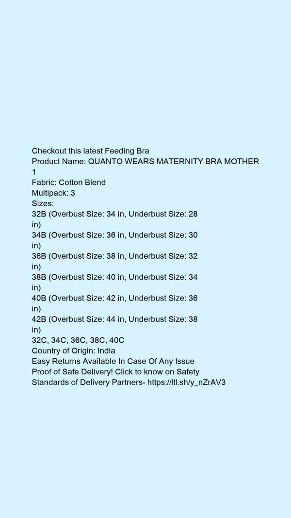 Product Name: *QUANTO WEARS MATERNITY BRA MOTHER 1*Fabric: Cotton BlendMultipack: 3