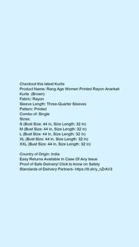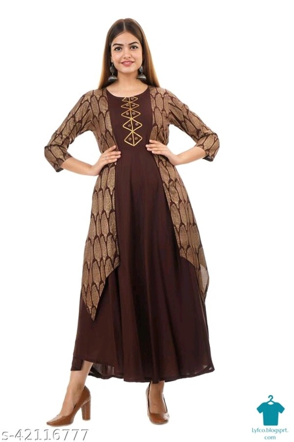 Product Name: *Rang Age Women Printed Rayon Anarkali Kurta (Brown)*Fabric: RayonSleeve Length: Three-Quarter SleevesPattern: PrintedCombo of: Single