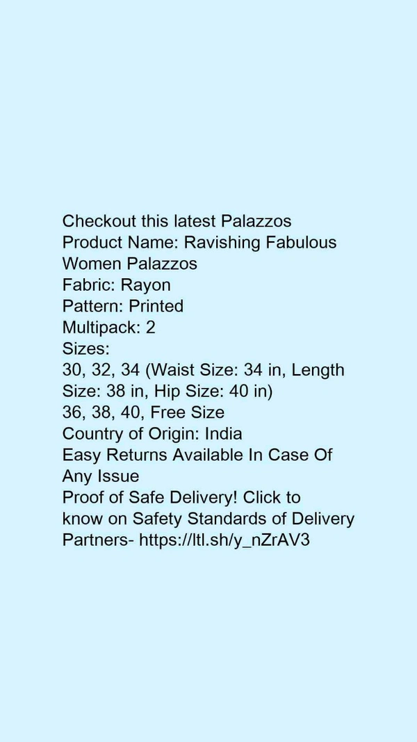 Product Name: *Ravishing Fabulous Women Palazzos*Fabric: RayonPattern: PrintedMultipack: 2