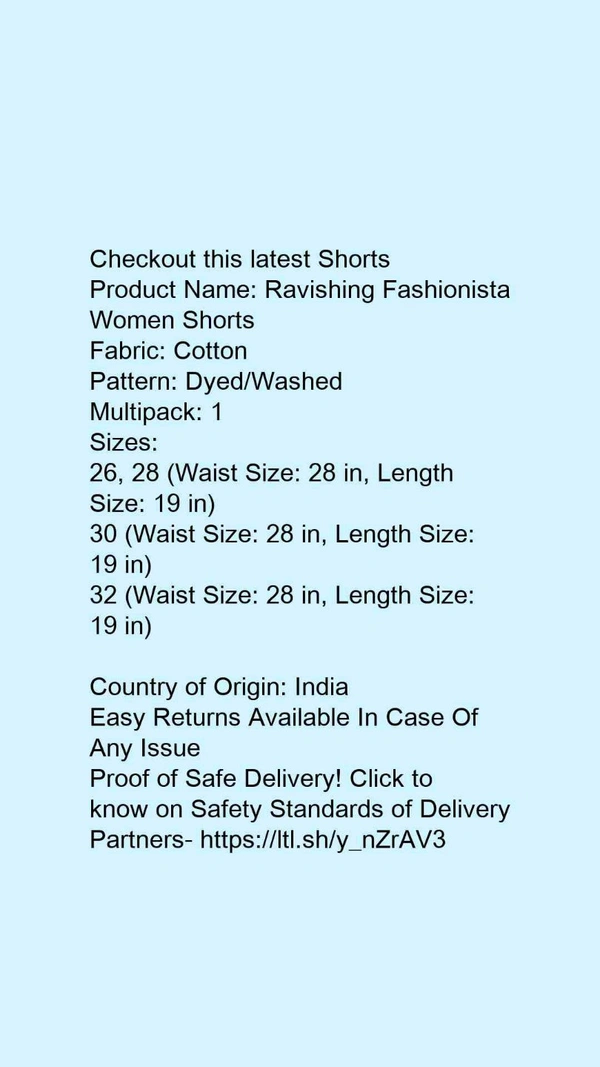 Product Name: *Ravishing Fashionista Women Shorts*Fabric: CottonPattern: Dyed/WashedMultipack: 1