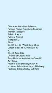 Product Name: *Ravishing Feminine Women Palazzos*Fabric: RayonPattern: PrintedMultipack: 2