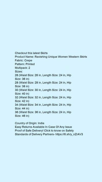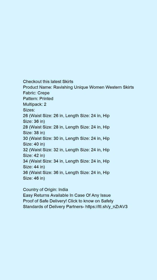 Product Name: *Ravishing Unique Women Western Skirts*Fabric: CrepePattern: PrintedMultipack: 2