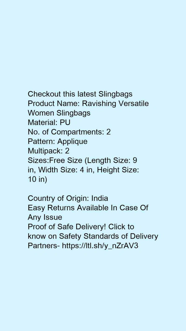Product Name: *Ravishing Versatile Women Slingbags*Material: PUNo. of Compartments: 2Pattern: AppliqueMultipack: 2