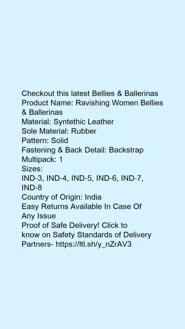 Product Name: *Ravishing Women Bellies & Ballerinas*Material: Syntethic LeatherSole Material: RubberPattern: SolidFastening & Back Detail: BackstrapMultipack: 1