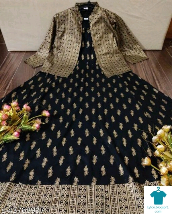 Product Name: *Rayon Anarkali Dress Flared Kurti with Detachable Jacket Tussels and Gold Print *Fabric: RayonSleeve Length: Three-Quarter SleevesPattern: PrintedCombo of: Single