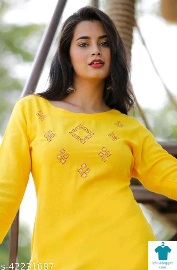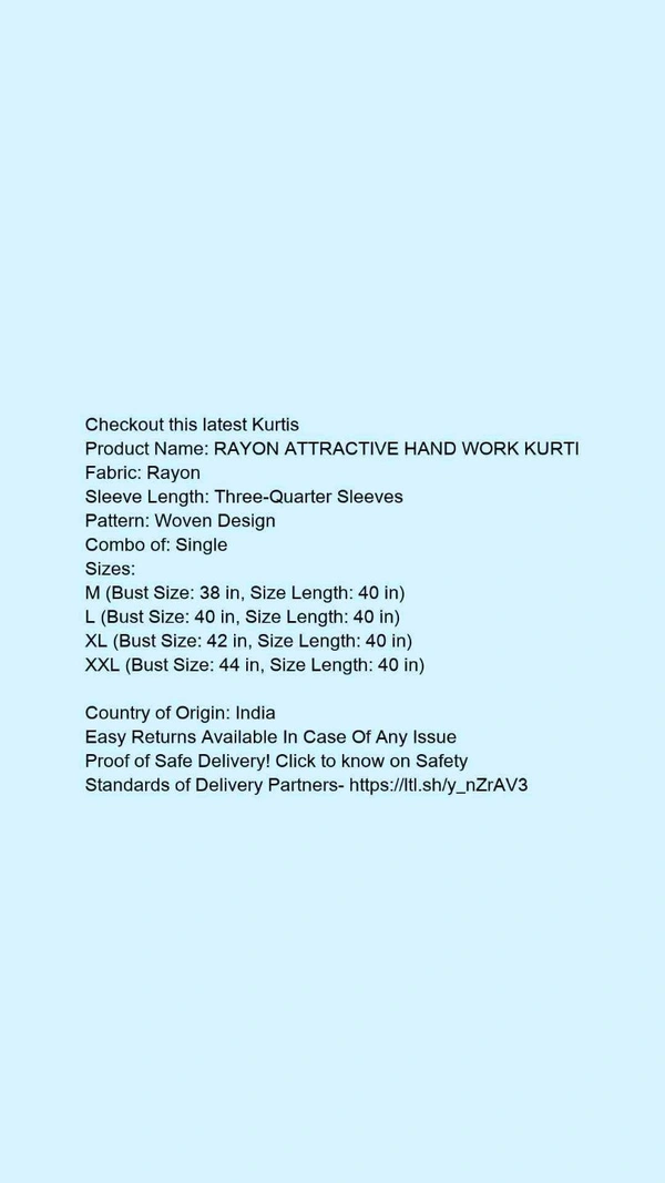 Product Name: *RAYON ATTRACTIVE HAND WORK KURTI*Fabric: RayonSleeve Length: Three-Quarter SleevesPattern: Woven DesignCombo of: Single