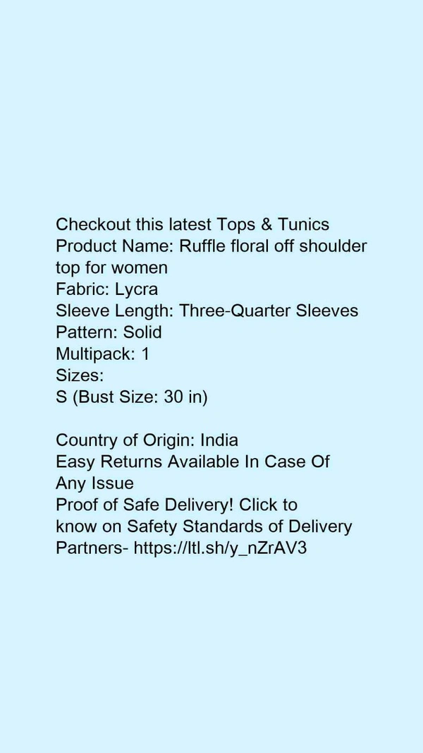 Product Name: *Ruffle floral off shoulder top for women*Fabric: LycraSleeve Length: Three-Quarter SleevesPattern: SolidMultipack: 1