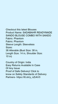 Product Name: *SADABAHR READYMADE SANDO BLOUSE COMBO WITH SANDO*Fabric: PhantomFabric: PhantomSleeve Length: Sleeveless