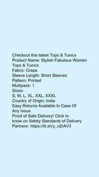 Product Name: *Stylish Fabulous Women Tops & Tunics*Fabric: CrepeSleeve Length: Short SleevesPattern: PrintedMultipack: 1