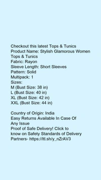 Product Name: *Stylish Glamorous Women Tops & Tunics*Fabric: RayonSleeve Length: Short SleevesPattern: SolidMultipack: 1