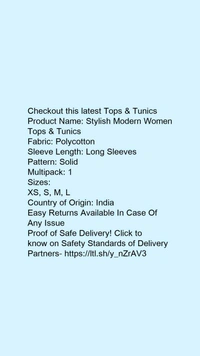Product Name: *Stylish Modern Women Tops & Tunics*Fabric: PolycottonSleeve Length: Long SleevesPattern: SolidMultipack: 1