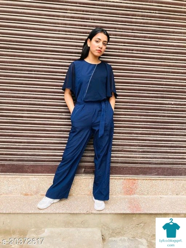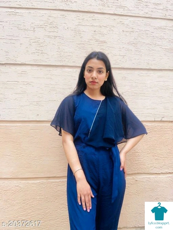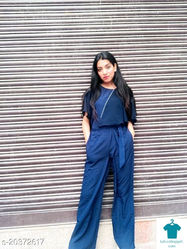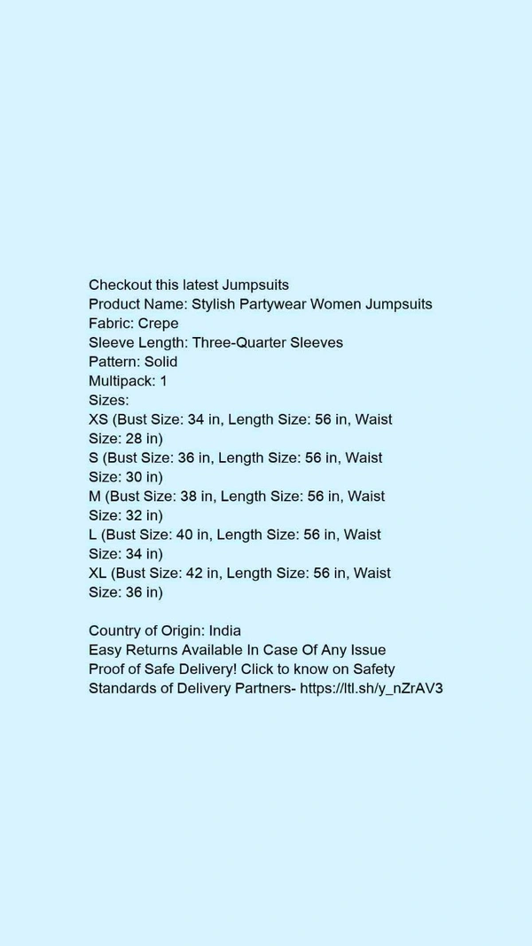 Product Name: *Stylish Partywear Women Jumpsuits*Fabric: CrepeSleeve Length: Three-Quarter SleevesPattern: SolidMultipack: 1