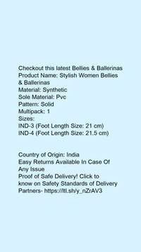 Product Name: *Stylish Women Bellies & Ballerinas*Material: SyntheticSole Material: PvcPattern: SolidMultipack: 1