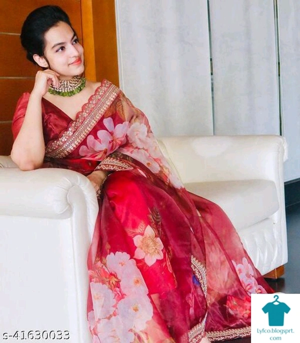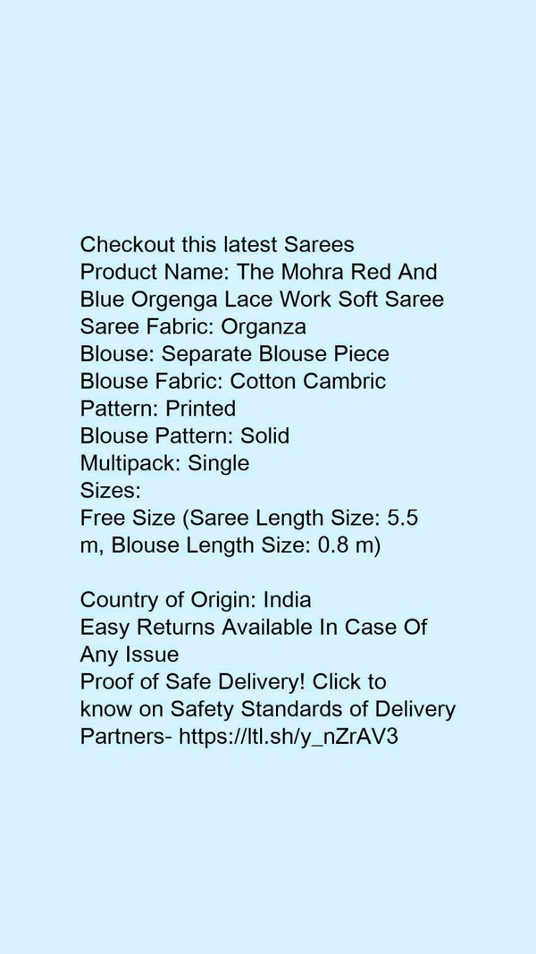 Product Name: *The Mohra Red And Blue Orgenga Lace Work Soft Saree*Saree Fabric: OrganzaBlouse: Separate Blouse PieceBlouse Fabric: Cotton CambricPattern: PrintedBlouse Pattern: SolidMultipack: Single
