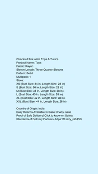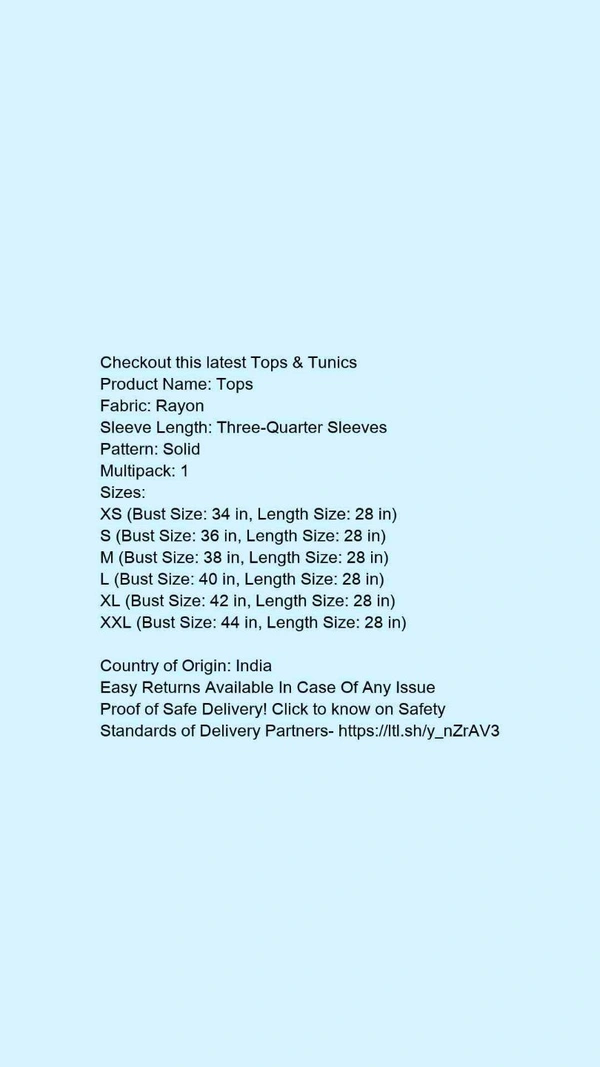 Product Name: *Tops*Fabric: RayonSleeve Length: Three-Quarter SleevesPattern: SolidMultipack: 1