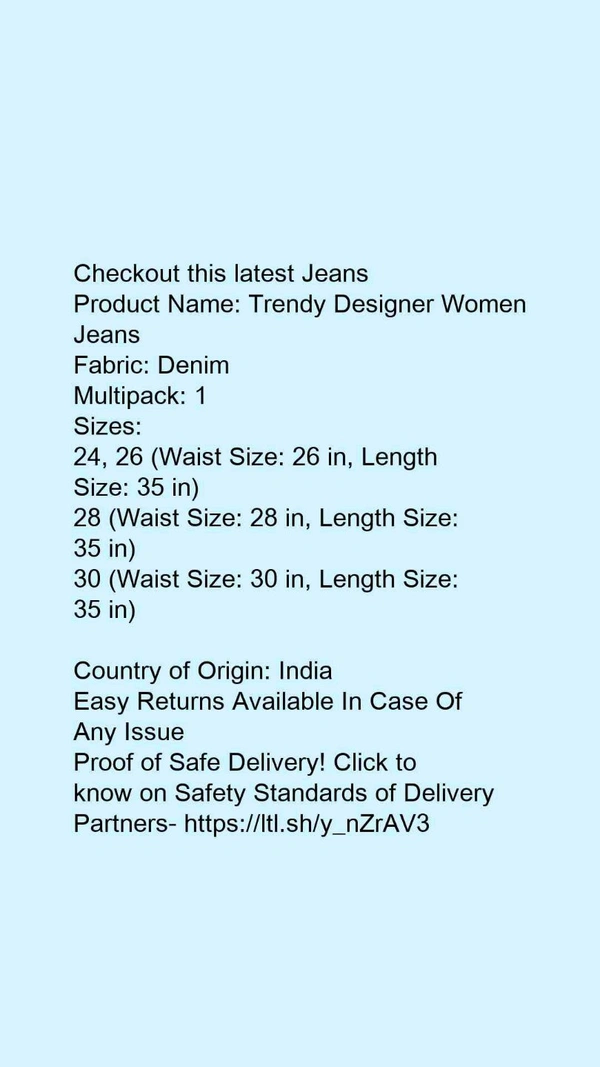 Product Name: *Trendy Designer Women Jeans*Fabric: DenimMultipack: 1