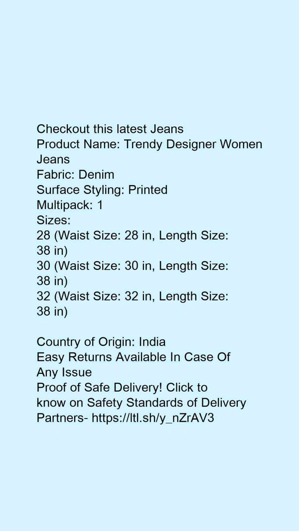 Product Name: *Trendy Designer Women Jeans*Fabric: DenimSurface Styling: PrintedMultipack: 1
