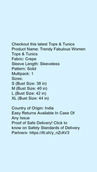 Product Name: *Trendy Fabulous Women Tops & Tunics*Fabric: CrepeSleeve Length: SleevelessPattern: SolidMultipack: 1