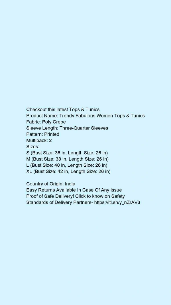 Product Name: *Trendy Fabulous Women Tops & Tunics*Fabric: Poly CrepeSleeve Length: Three-Quarter SleevesPattern: PrintedMultipack: 2