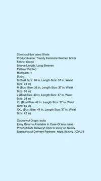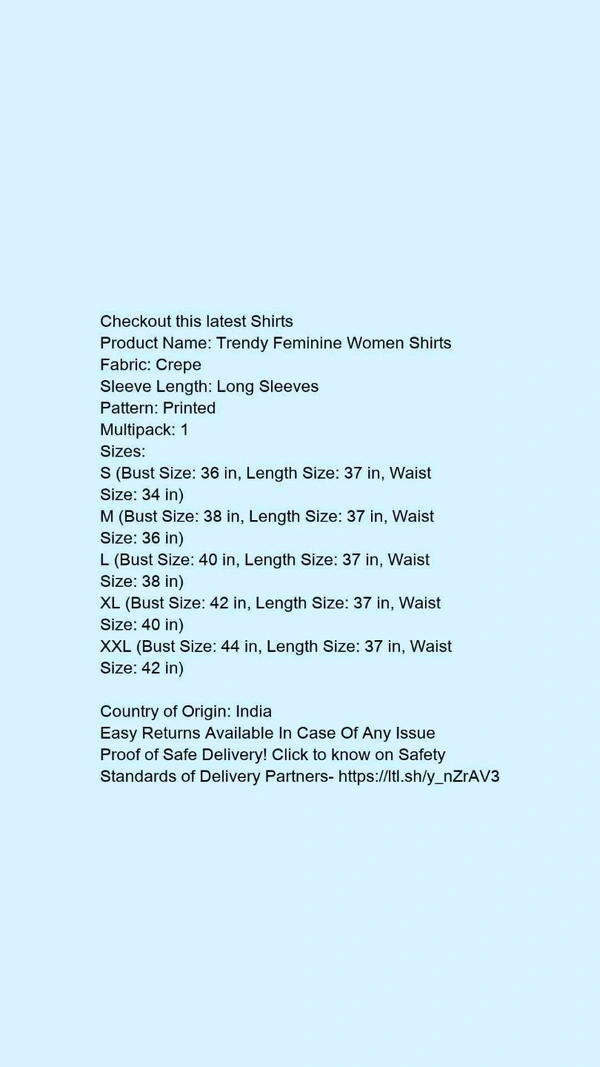 Product Name: *Trendy Feminine Women Shirts*Fabric: CrepeSleeve Length: Long SleevesPattern: PrintedMultipack: 1