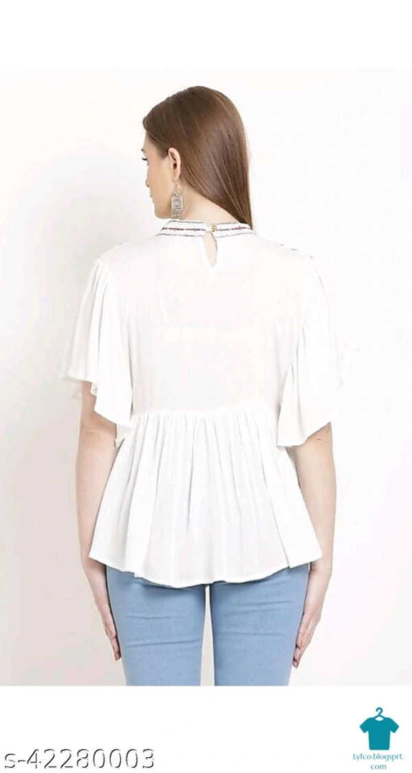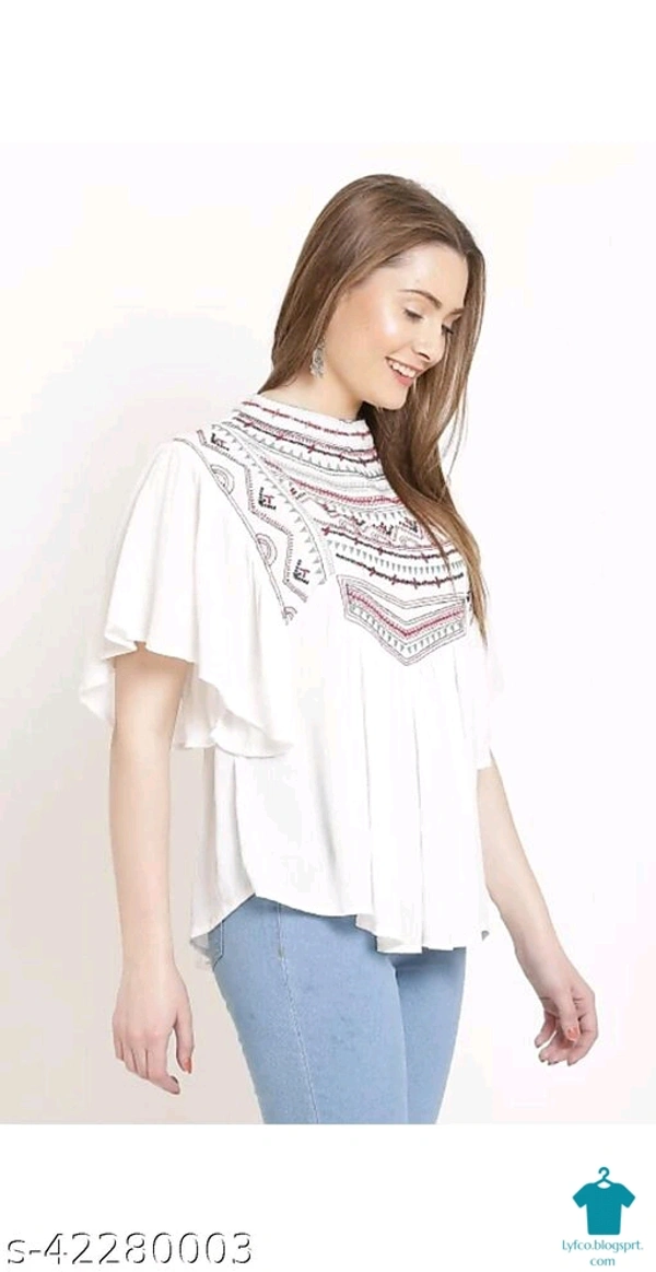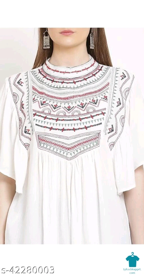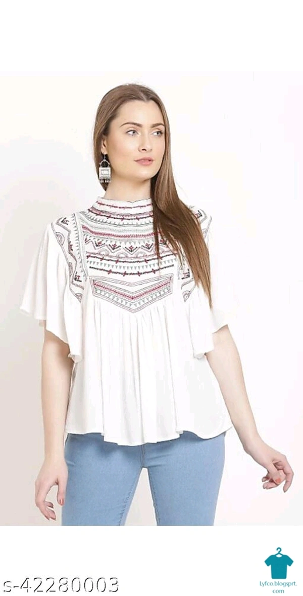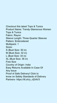 Product Name: *Trendy Glamorous Women Tops & Tunics*Fabric: RayonSleeve Length: Three-Quarter SleevesPattern: EmbroideredMultipack: 1