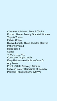 Product Name: *Trendy Graceful Women Tops & Tunics*Fabric: CrepeSleeve Length: Three-Quarter SleevesPattern: PrintedMultipack: 1