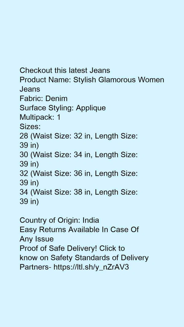 Product Name: *Trendy Latest Women Jeans*Fabric: DenimSurface Styling: AppliqueMultipack: 1