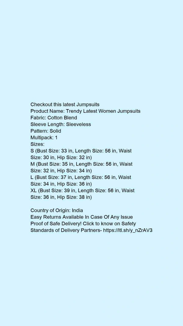 Product Name: *Trendy Latest Women Jumpsuits*Fabric: Cotton BlendSleeve Length: SleevelessPattern: SolidMultipack: 1