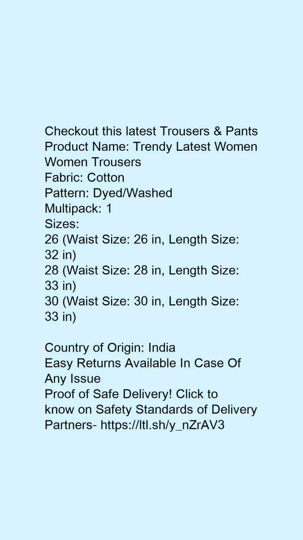 Product Name: *Trendy Latest Women Women Trousers *Fabric: CottonPattern: Dyed/WashedMultipack: 1