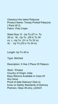 Product Name: *Trendy Printed Palazzos ( Pack Of 2)*Fabric: Poly Crepe