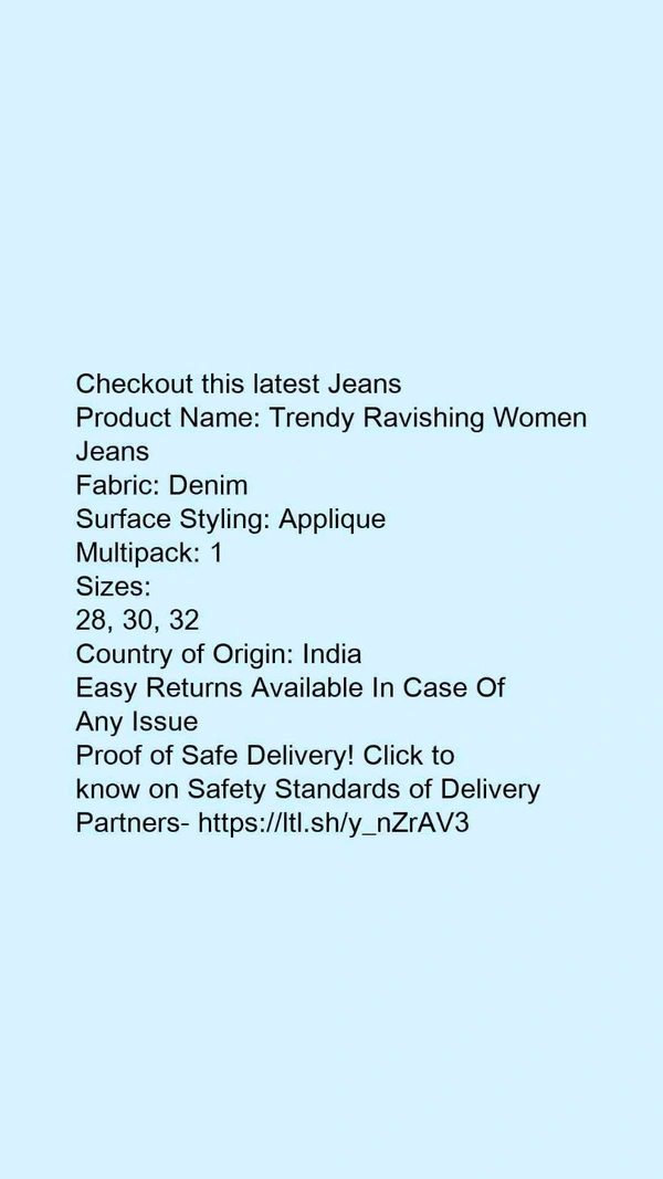 Product Name: *Trendy Ravishing Women Jeans*Fabric: DenimSurface Styling: AppliqueMultipack: 1