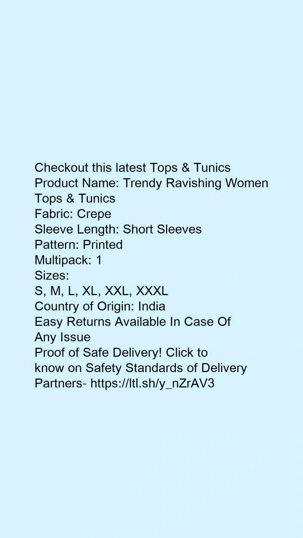 Product Name: *Trendy Ravishing Women Tops & Tunics*Fabric: CrepeSleeve Length: Short SleevesPattern: PrintedMultipack: 1